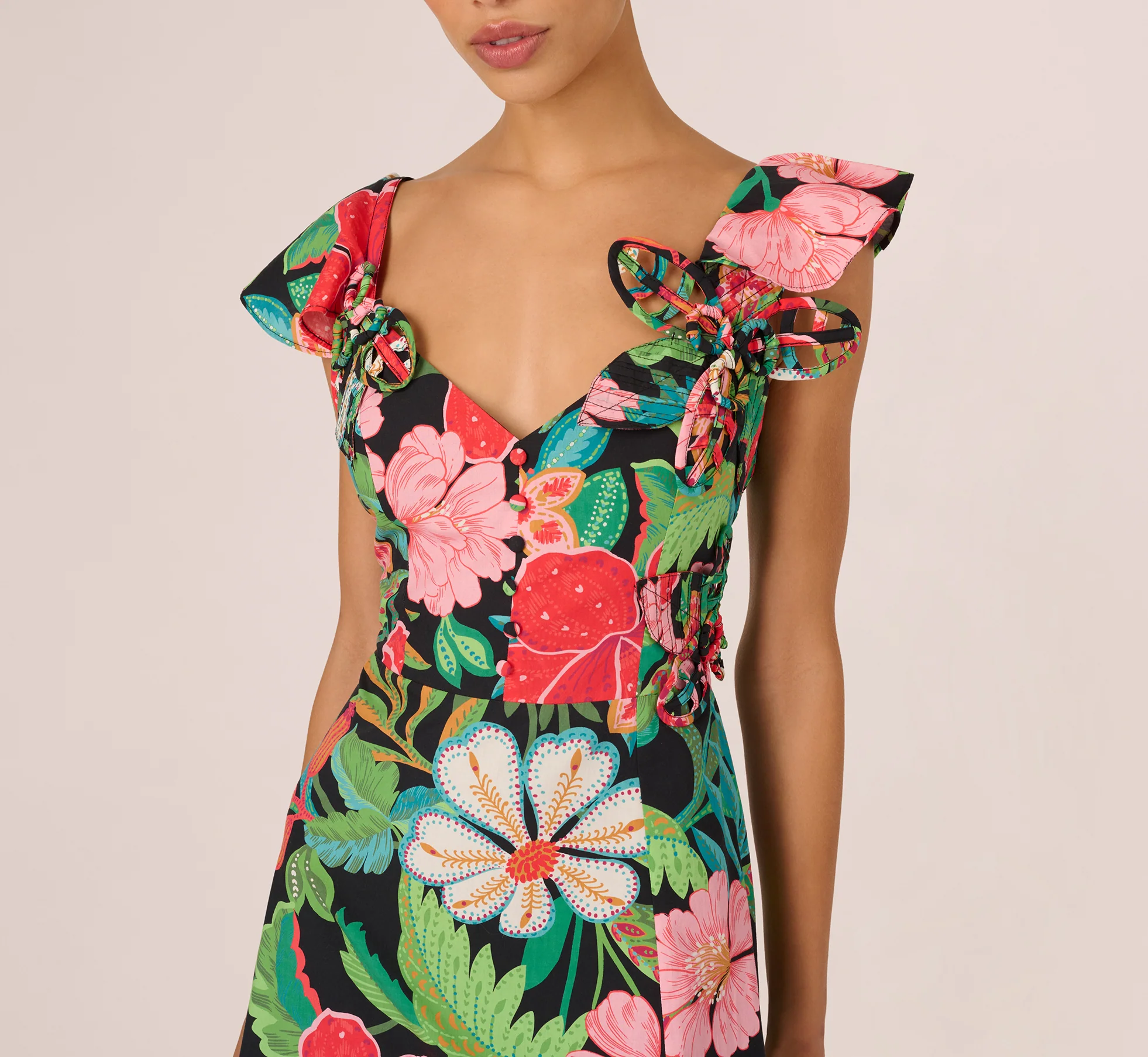 A joyful statement in vivid color, this midi dress is tailored from crisp cotton and cut in a mid calf A line silhouette. The bodice is framed by flutter sleeves and sculptural floral appliques that highlight the V neckline. Designed in a bold tropical floral print, this dress is an elevated choice for sunny days, vacations, or garden parties.