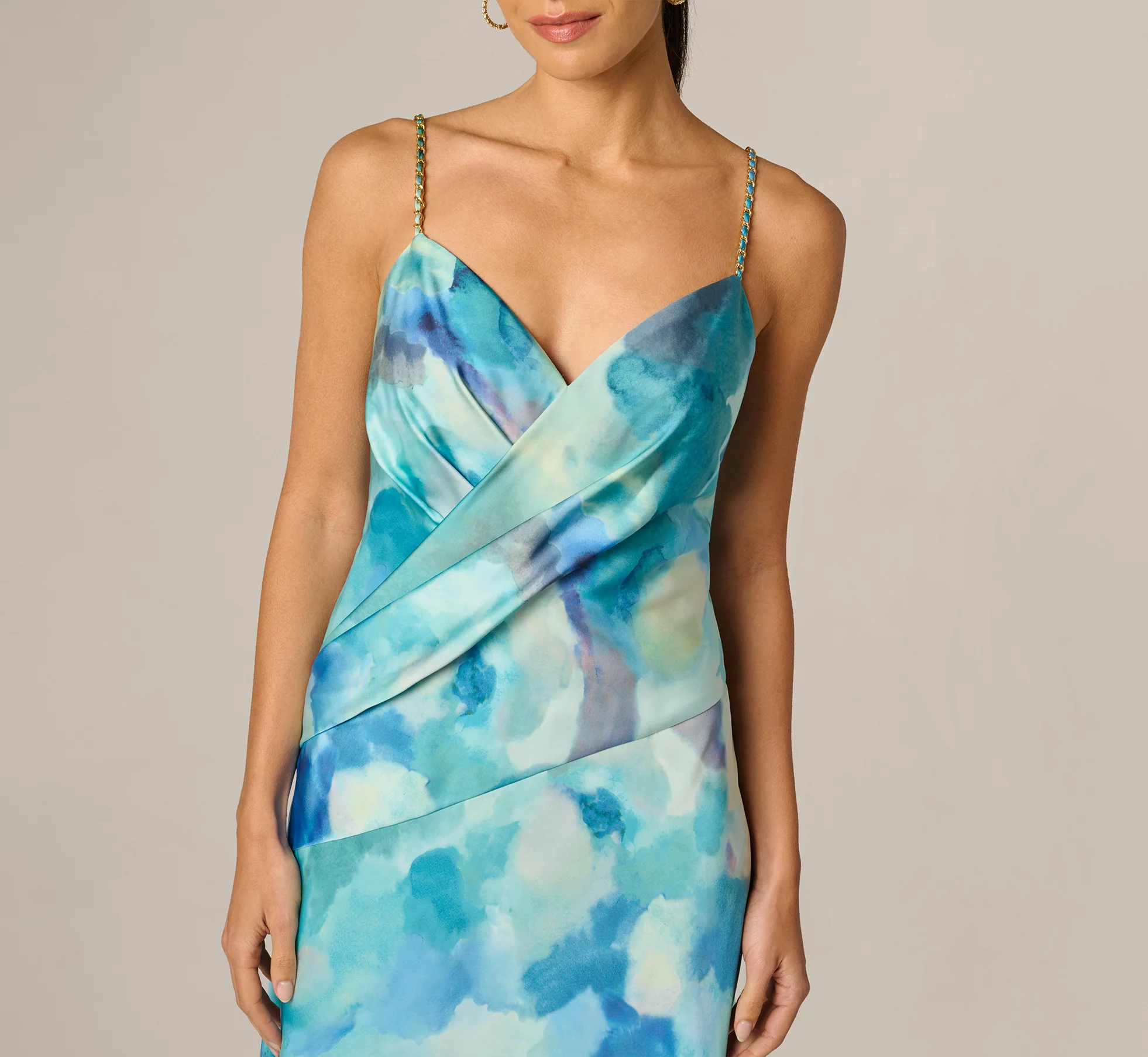 Crafted in luminous sateen, this sleeveless gown showcases a fluid A line silhouette washed in a soft watercolor print. The bodice features a draped crossover construction, anchored by a V neckline and delicate lace through chain straps. Princess seams through the back ensure a refined, tailored fit, while the flowing skirt lends graceful movement. Airy yet elegant, this evening dress is a polished choice for weddings, galas, and elevated soirees.