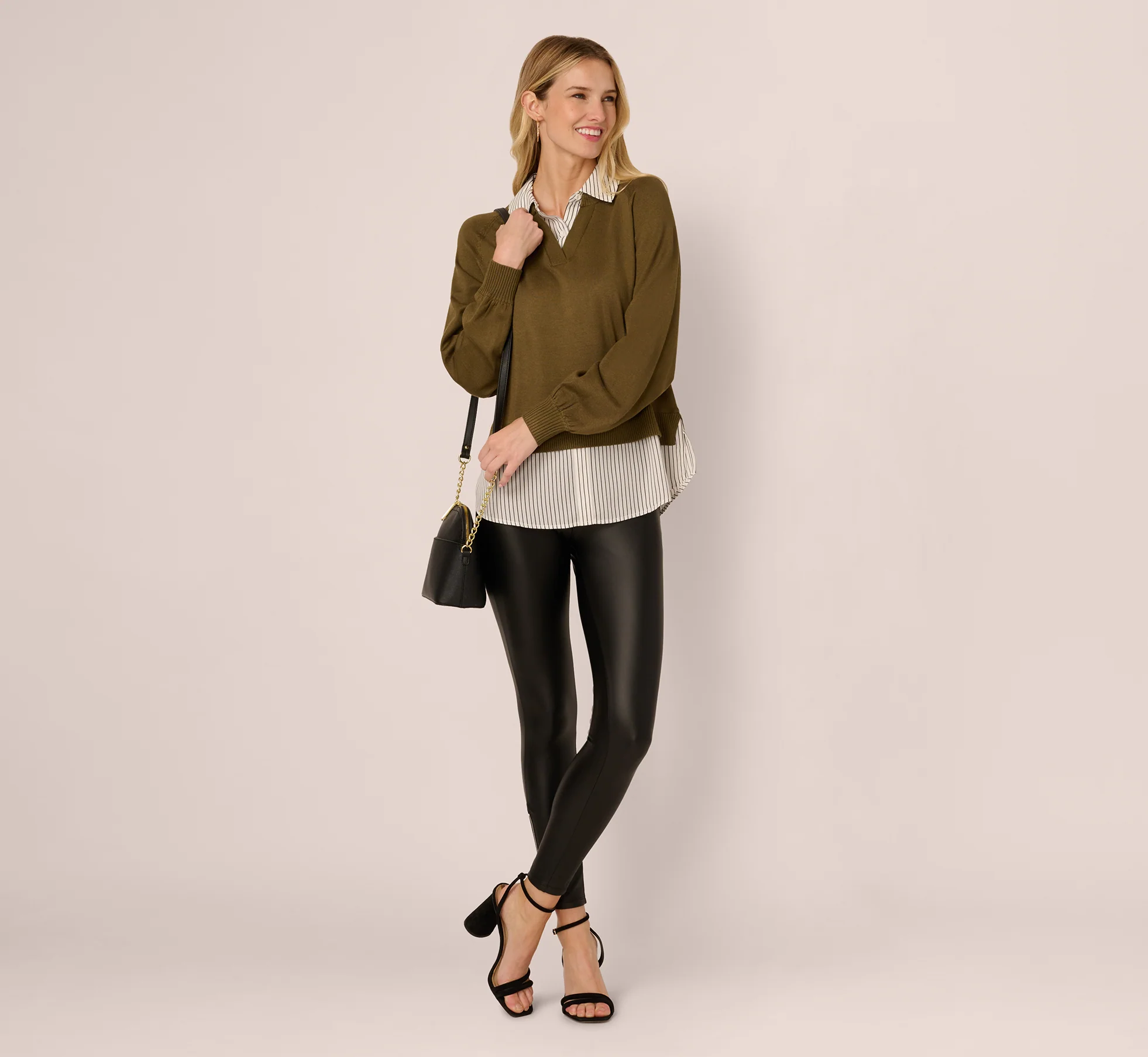 Long Sleeve Collared Printed Twover Sweater In Oak Olive W Iv Blministripe