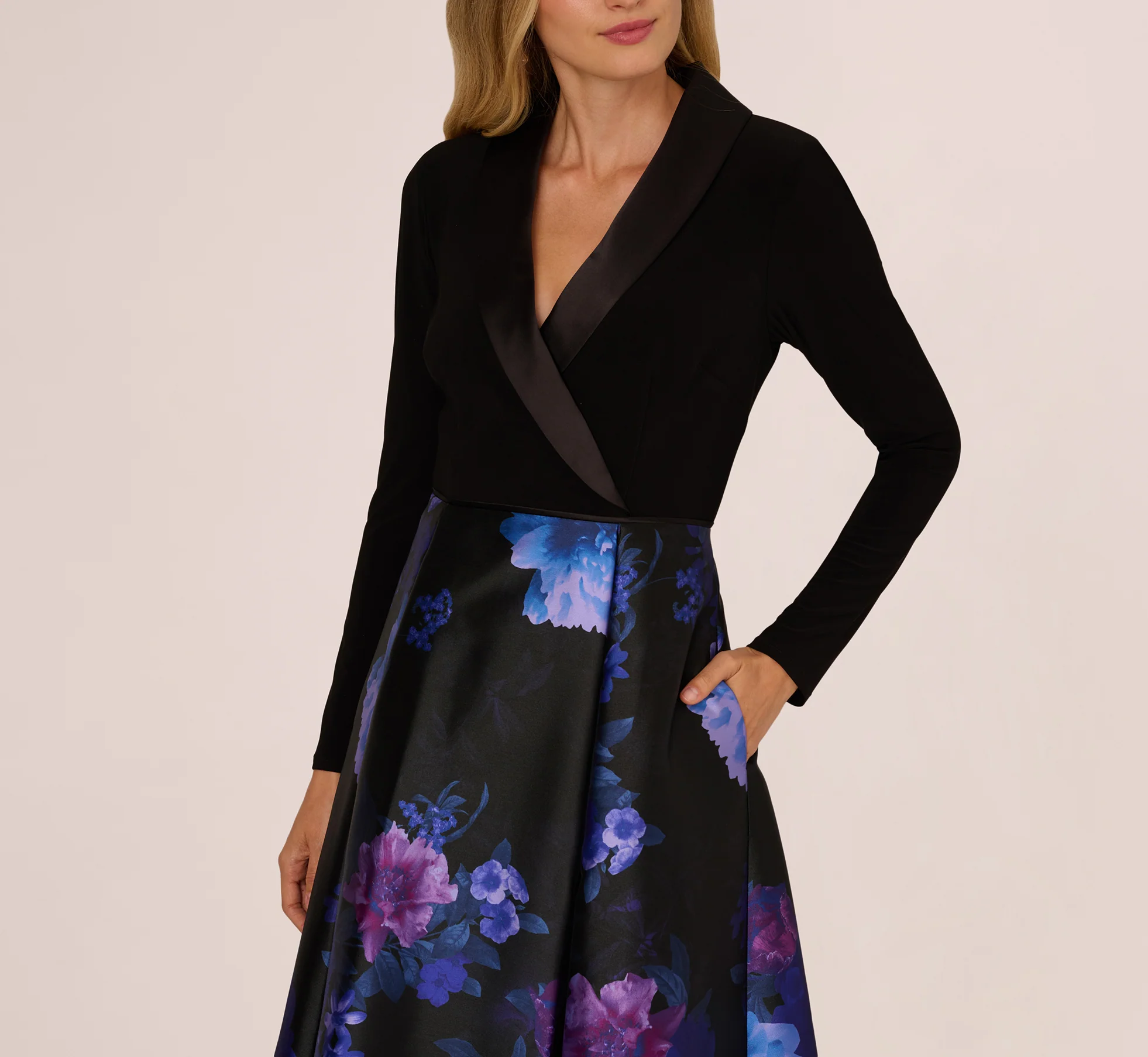 This elegant evening gown marries sleek tailoring with dramatic flair. The bodice is cut from soft jersey in a faux wrap construction, framed by long sleeves and a sophisticated satin shawl lapel. A voluminous pleated A line skirt in floral printed Mikado fabric creates striking contrast. Sheer organza illusion bands around the hem add sophisticated texture to the design. A refined statement, this dress is ideal for formal galas, weddings, and black tie celebrations.
