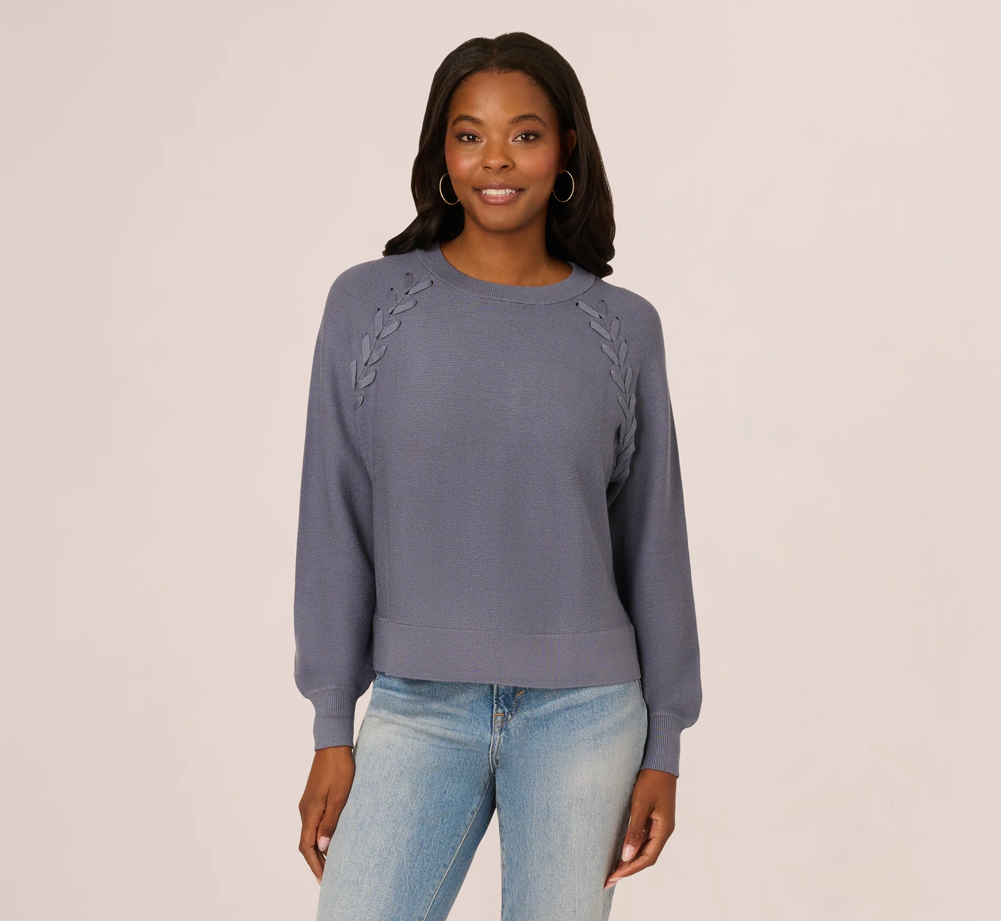 Long Sleeve Laced Raglan Sweater In Dusty Blue