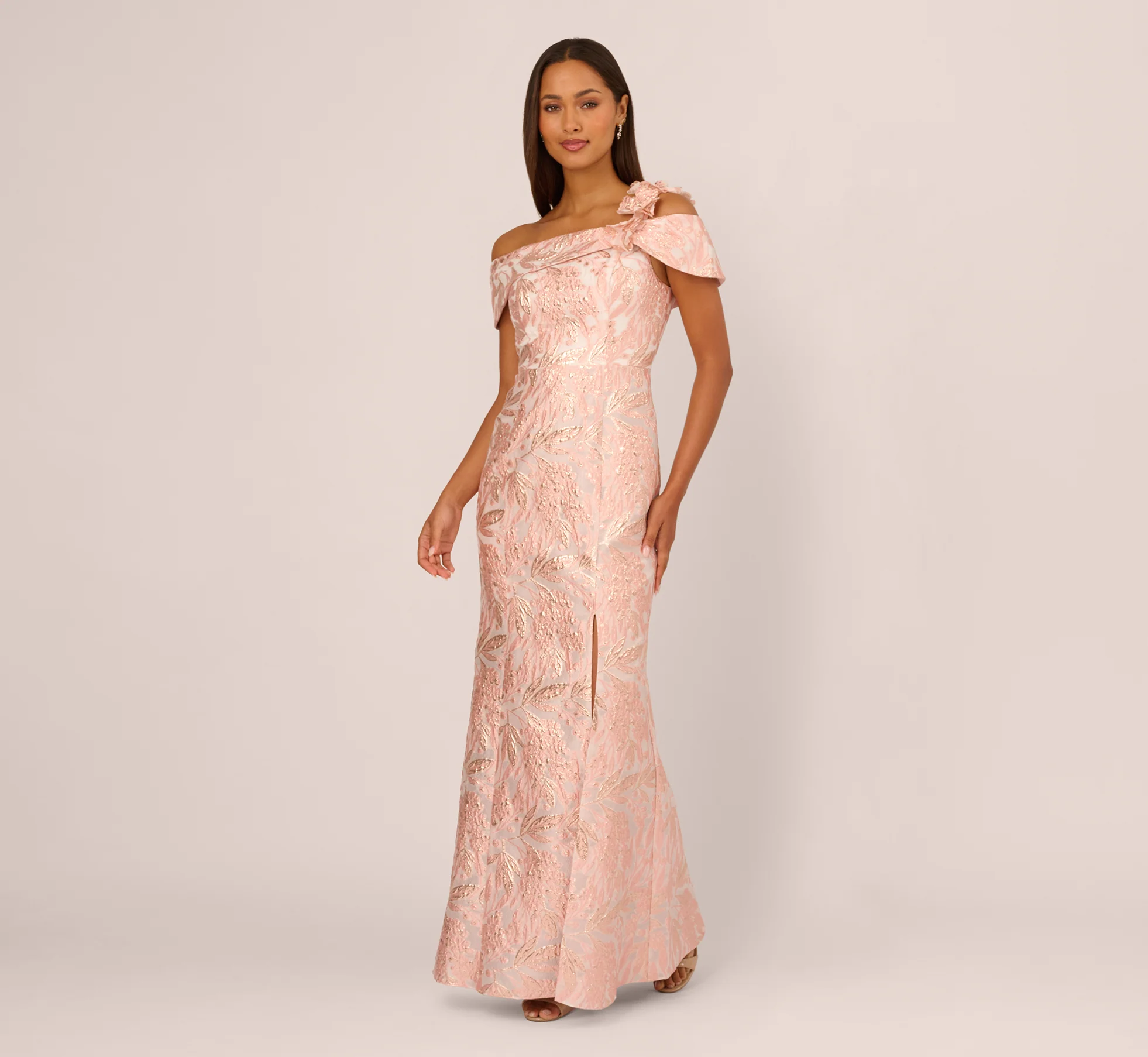Classic glamor meets modern detail in this stunning floor length gown design. A tailored mermaid silhouette shaped by princess seams brings elegant structure to the shimmering metallic jacquard fabric. The off the shoulder neckline features a graceful foldover detail and a single shoulder strap adorned with dimensional floral appliques. A front side slit adds movement and a touch of drama. Luxe and opulent, this gown is a refined choice for formal galas, weddings, or black tie celebrations.