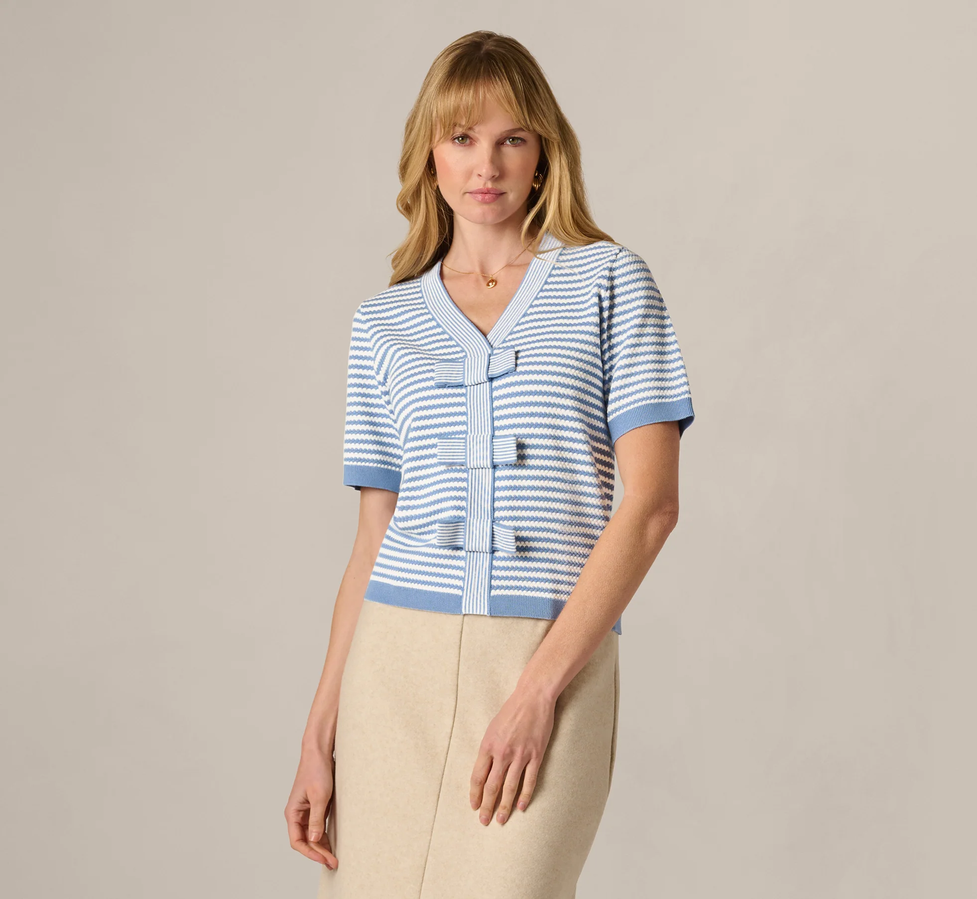 A playful take on classic polish, this short sleeve sweater is crafted from a cozy textured knit and cut in a relaxed fit. Designed with a pretty V neckline and above the elbow sleeves, it's detailed with cute bow accents down the front for a charming finishing touch. A fresh stripe pattern and contrast trim give it a crisp finish. Perfect for office looks and weekend ensembles, this sweater top will quickly become your new favorite for effortless refinement.