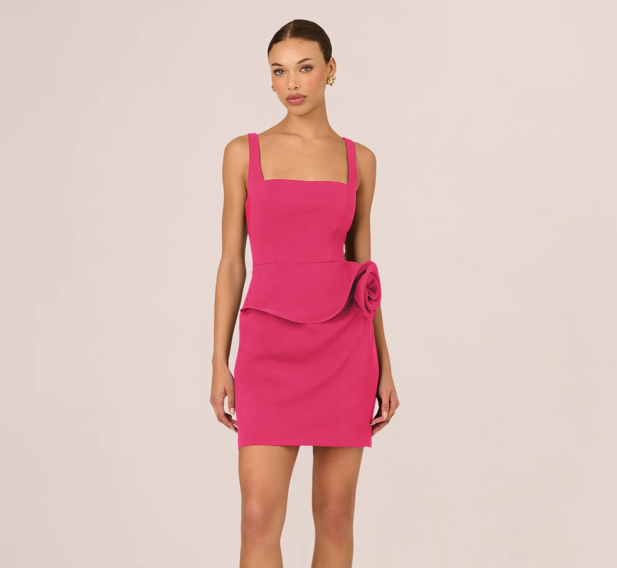 An artful update to the classic sheath dress, this sculpted mini is tailored from stretch crepe in a fitted silhouette. The square neckline and wide straps frame the face with clean lines, while a dramatic peplum detail unfurls into a bold rosette at the hip. Tailored yet playful, this short dress balances modern minimalism with architectural flourish, perfect for cocktail parties, gallery events, and evening celebrations.