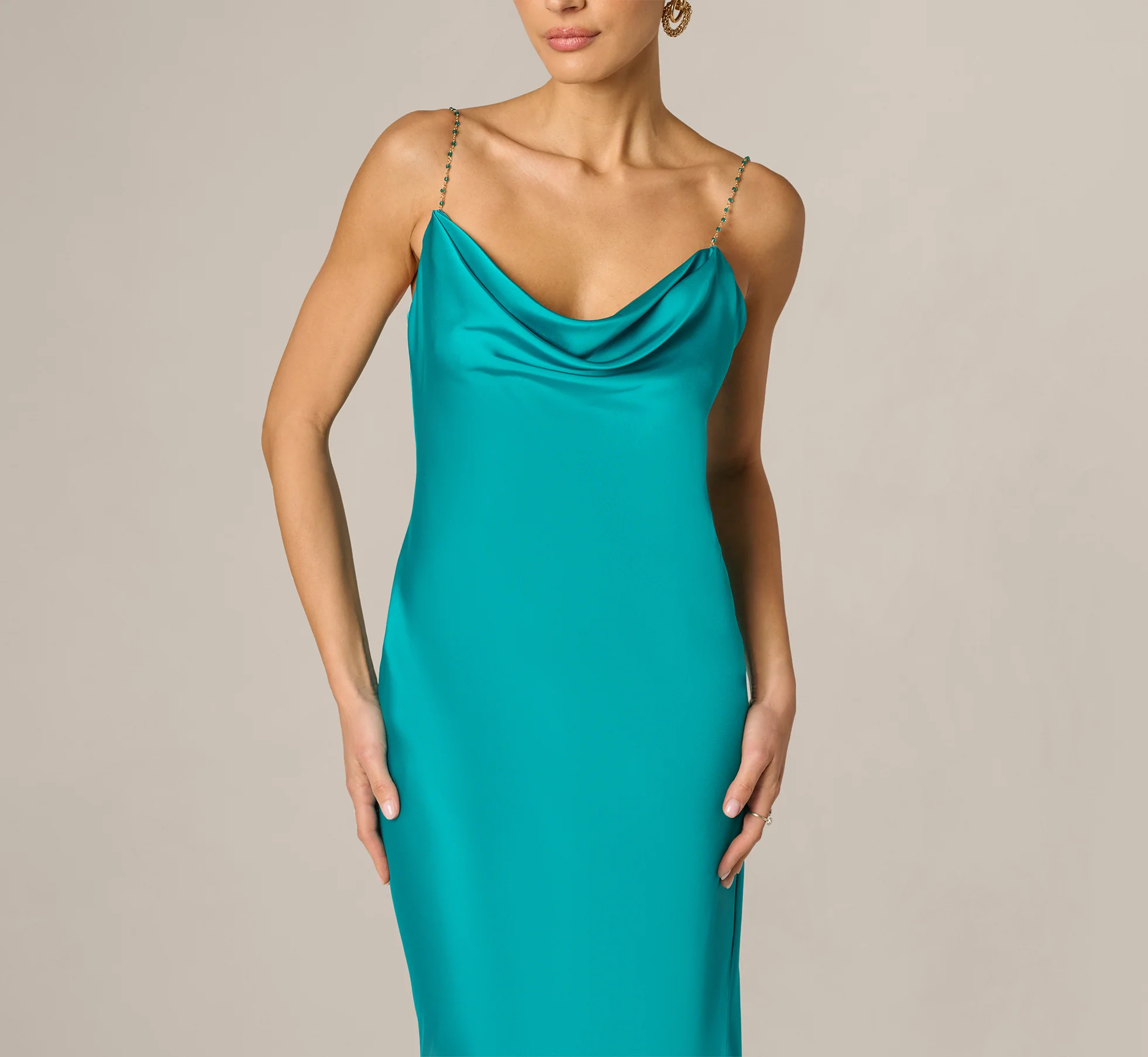 Cut on the bias for fluid movement and a flawless drape, this gown embodies graceful evening glamor. Stretch satin fabric adds soft luminosity and a comfortable fit to the flowing mermaid silhouette. A draped cowl neckline and delicate beaded chain straps create a luxe face framing moment. The open back is detailed with crisscrossing straps for a striking finish. Turn heads at your next black tie event or formal celebration in this stunning dress.