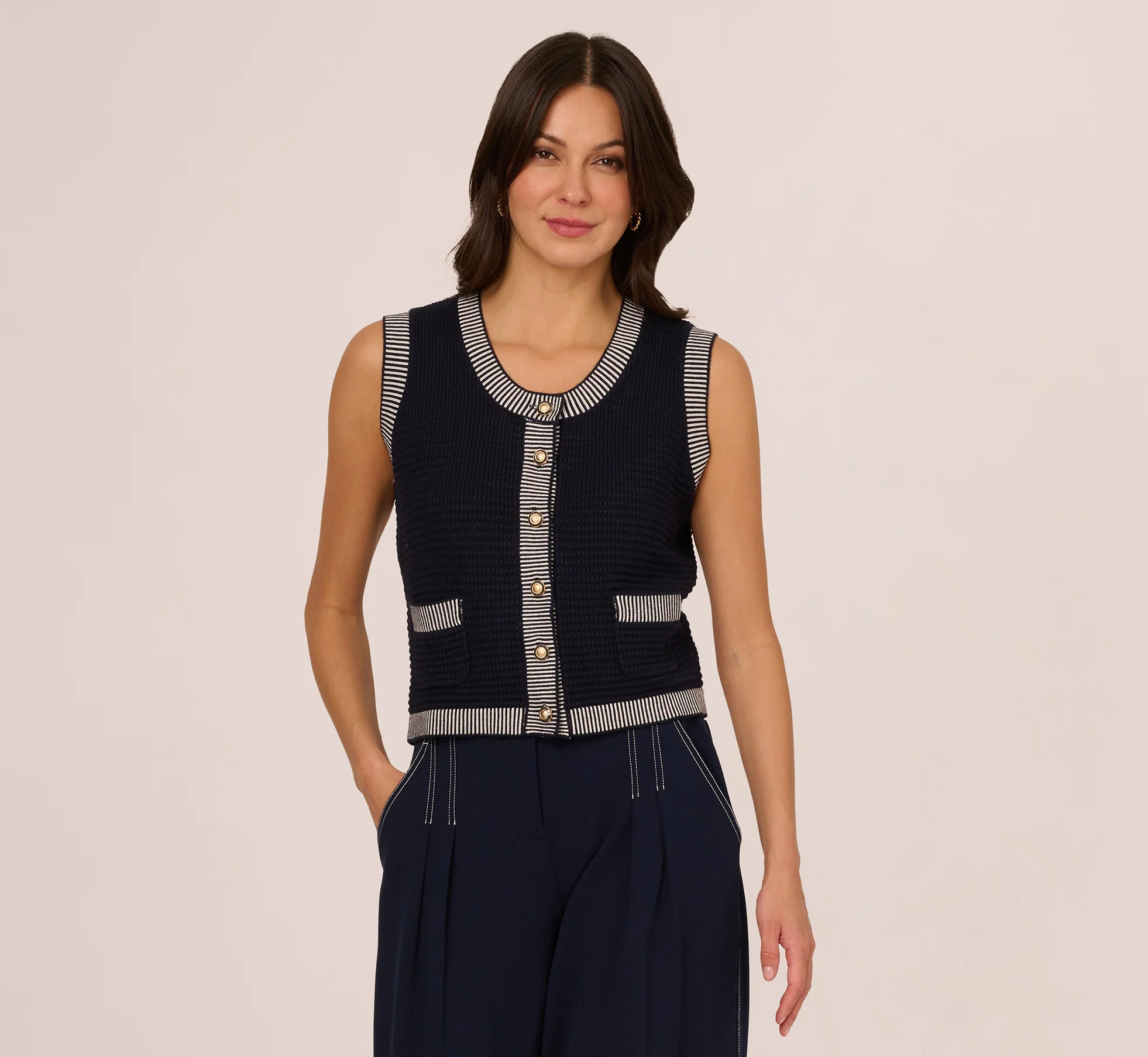 Striped Trim Cardigan Sweater Vest In Navy Ivory