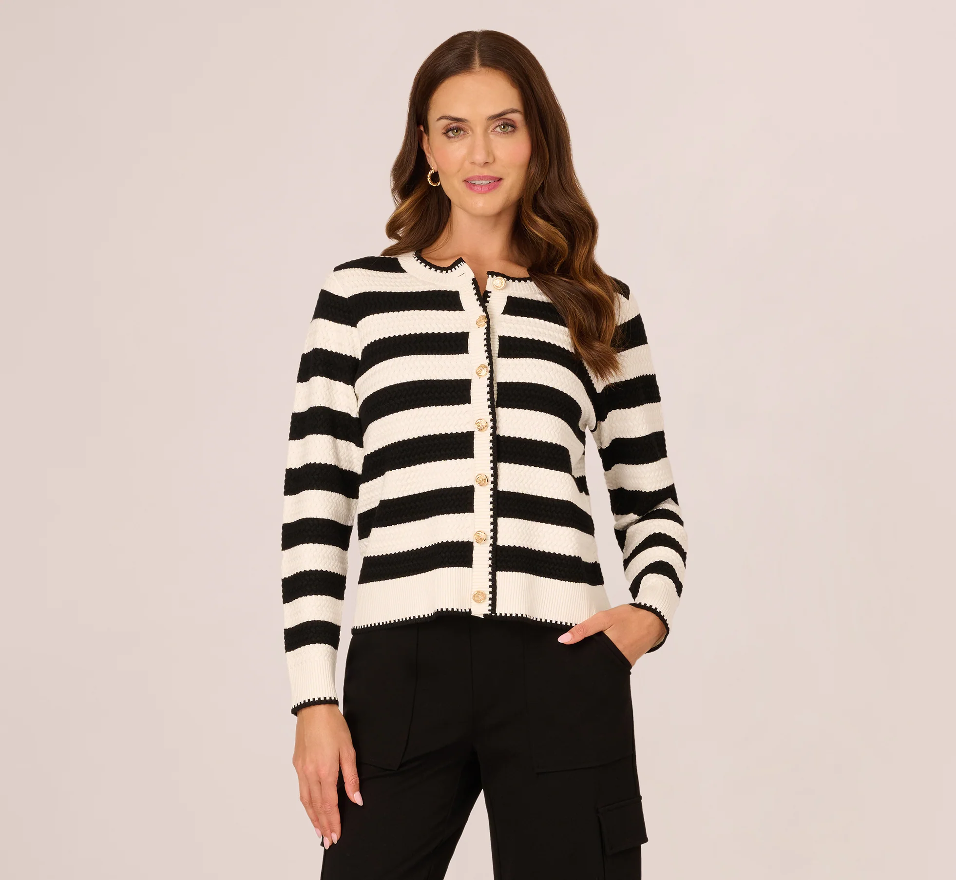 A timeless layer with a bold twist, this striped cardigan is knit from a substantial textured fabric in a classic pattern, offering a cozy feel with structure and polish. Designed in an easy relaxed fit, it features a refined crew neckline and metallic buttons down the front for a luxe touch. Perfect for office days, brunch dates, or anywhere in between, you'll find yourself reaching for this sweater again and again.